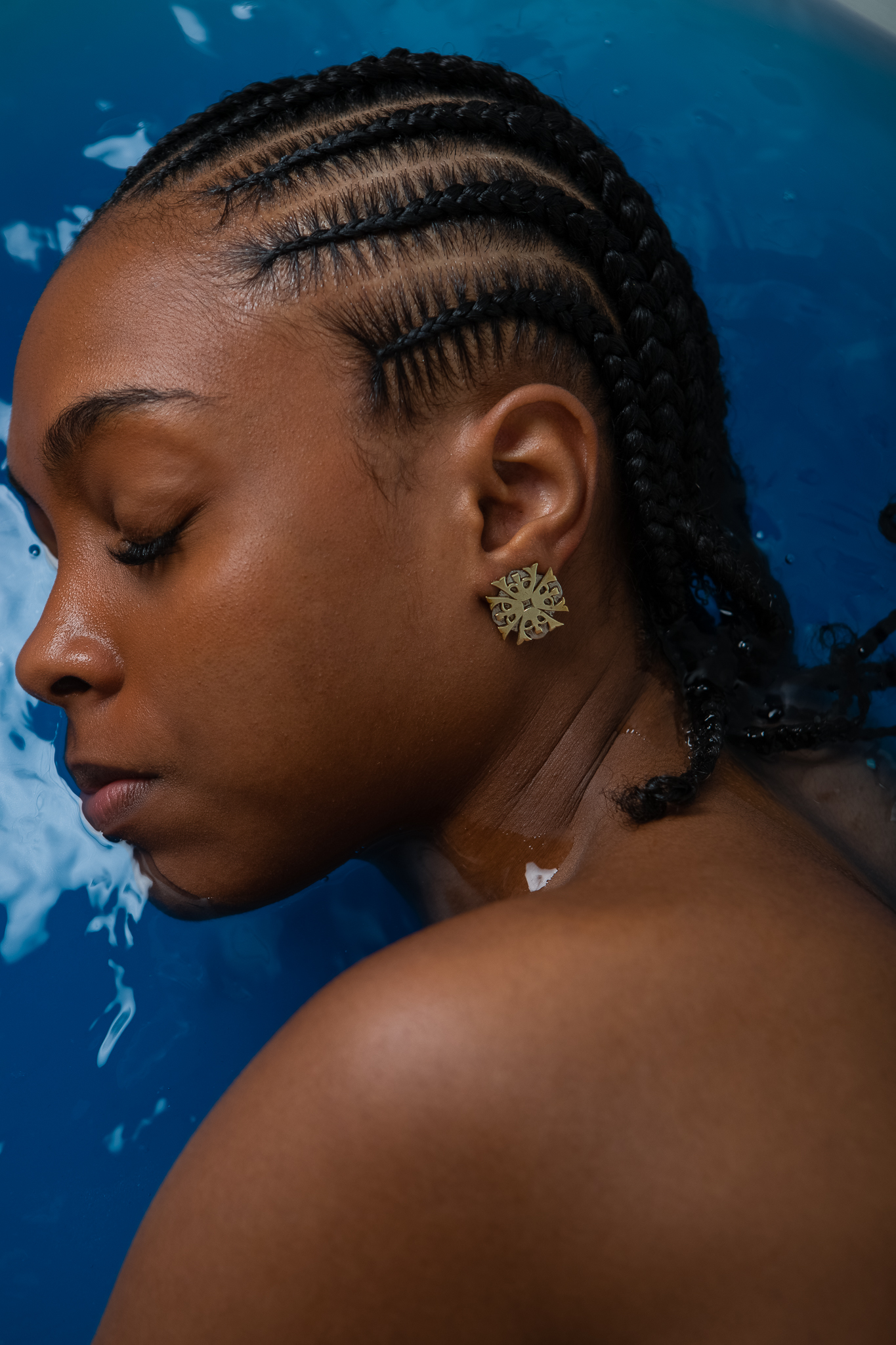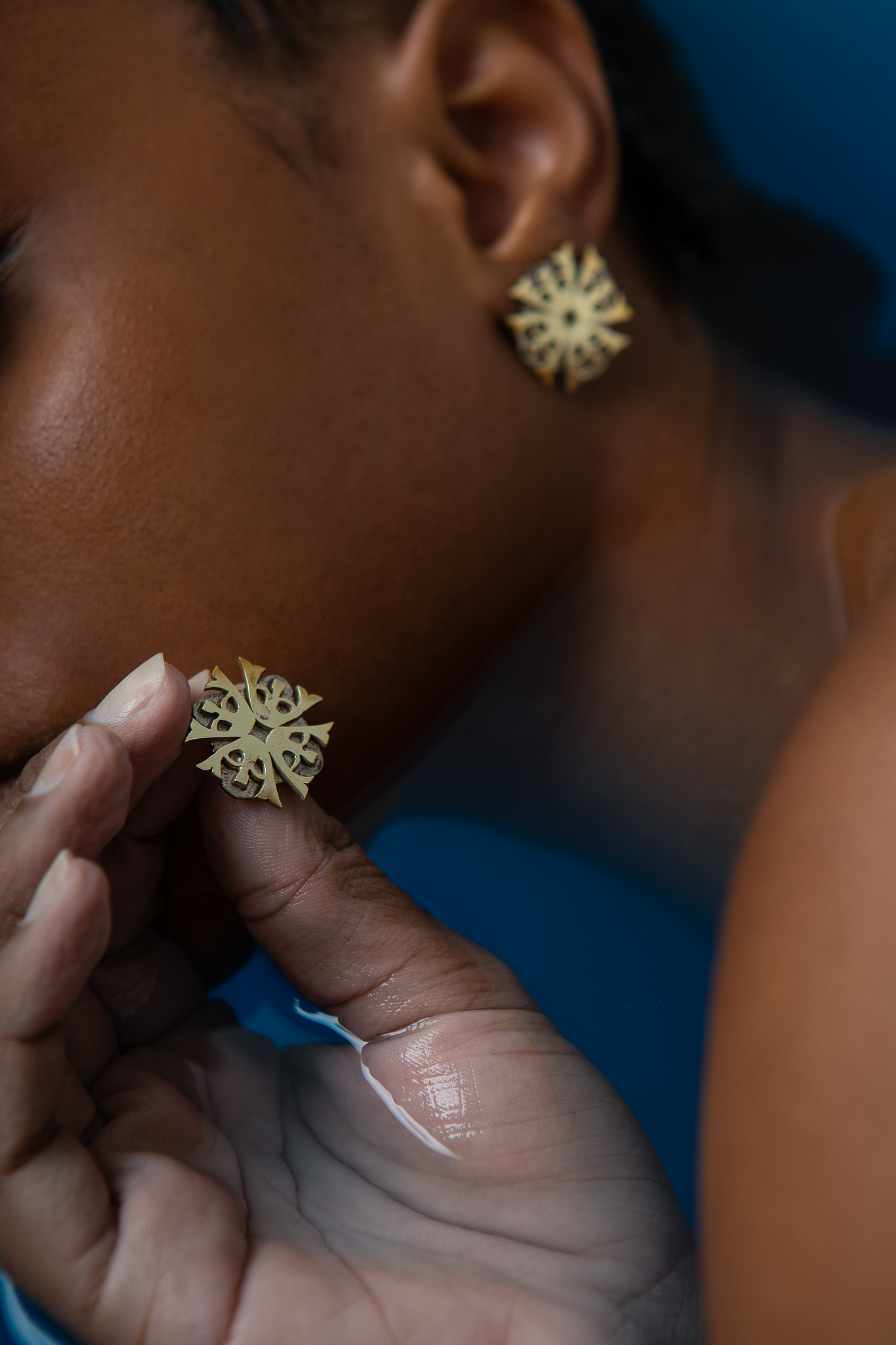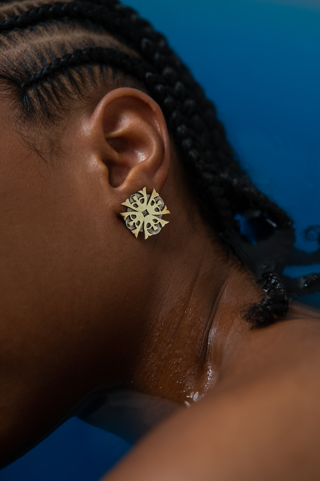 São quatro sereias em latão (dourado) com cabelo prateado (alpaca) e pino do brinco em prata. O desenho parece uma mandala, um brasão, de longe é mais um quadrado.