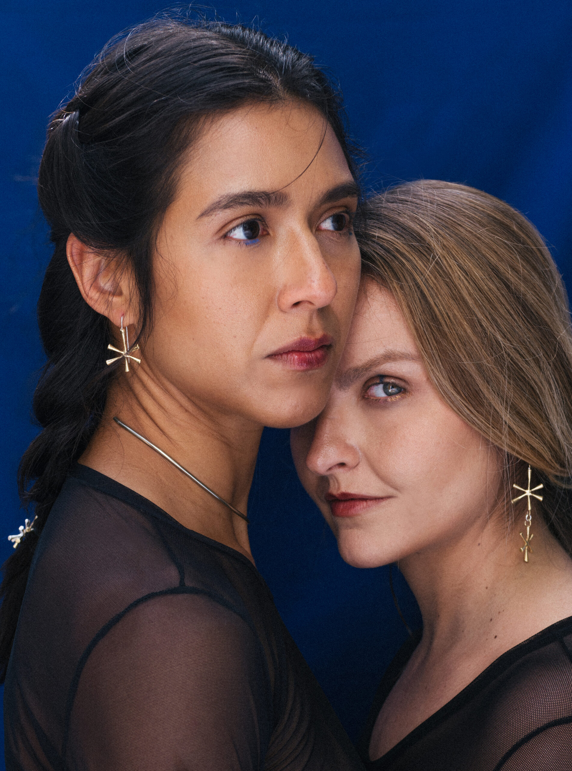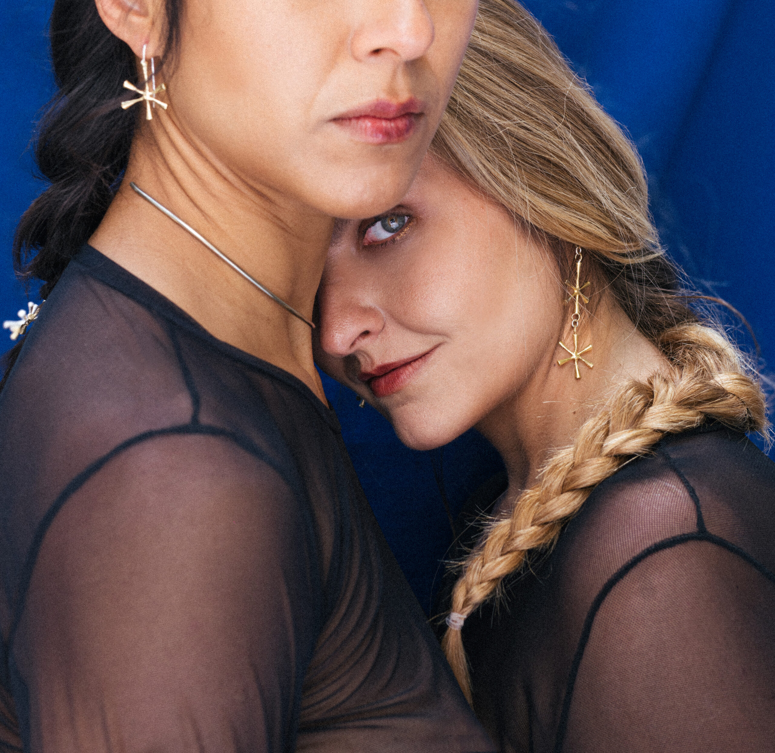 Brinco com estrelitza em latão e gancho em prata. O gancho permite movimento na orelha e descola a estrelitza, que fica abaixo da altura do lóbulo, pendurada.