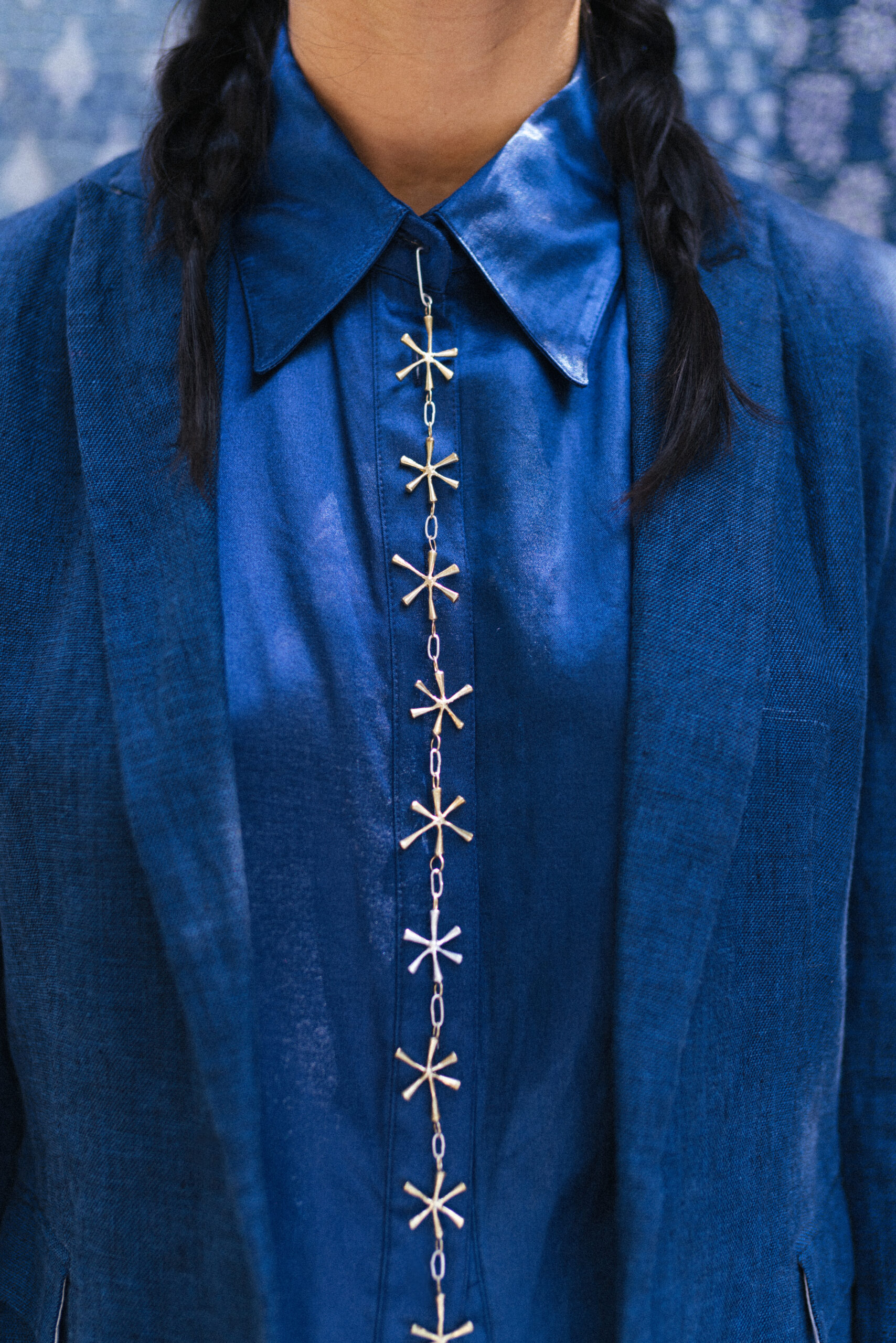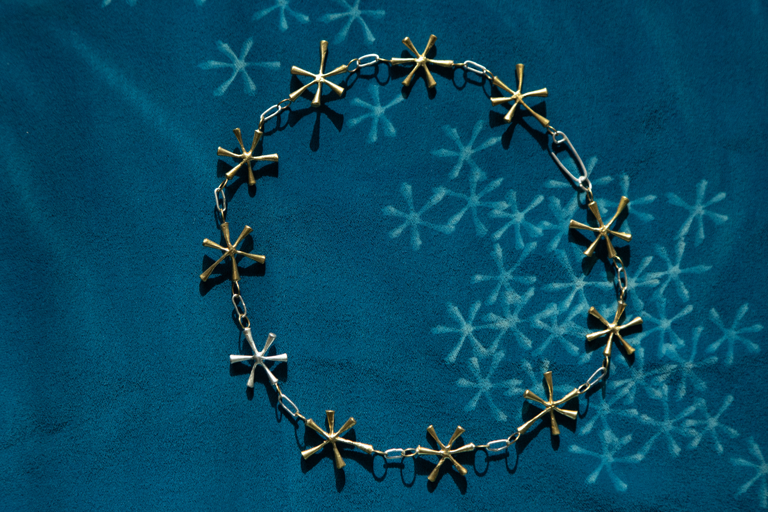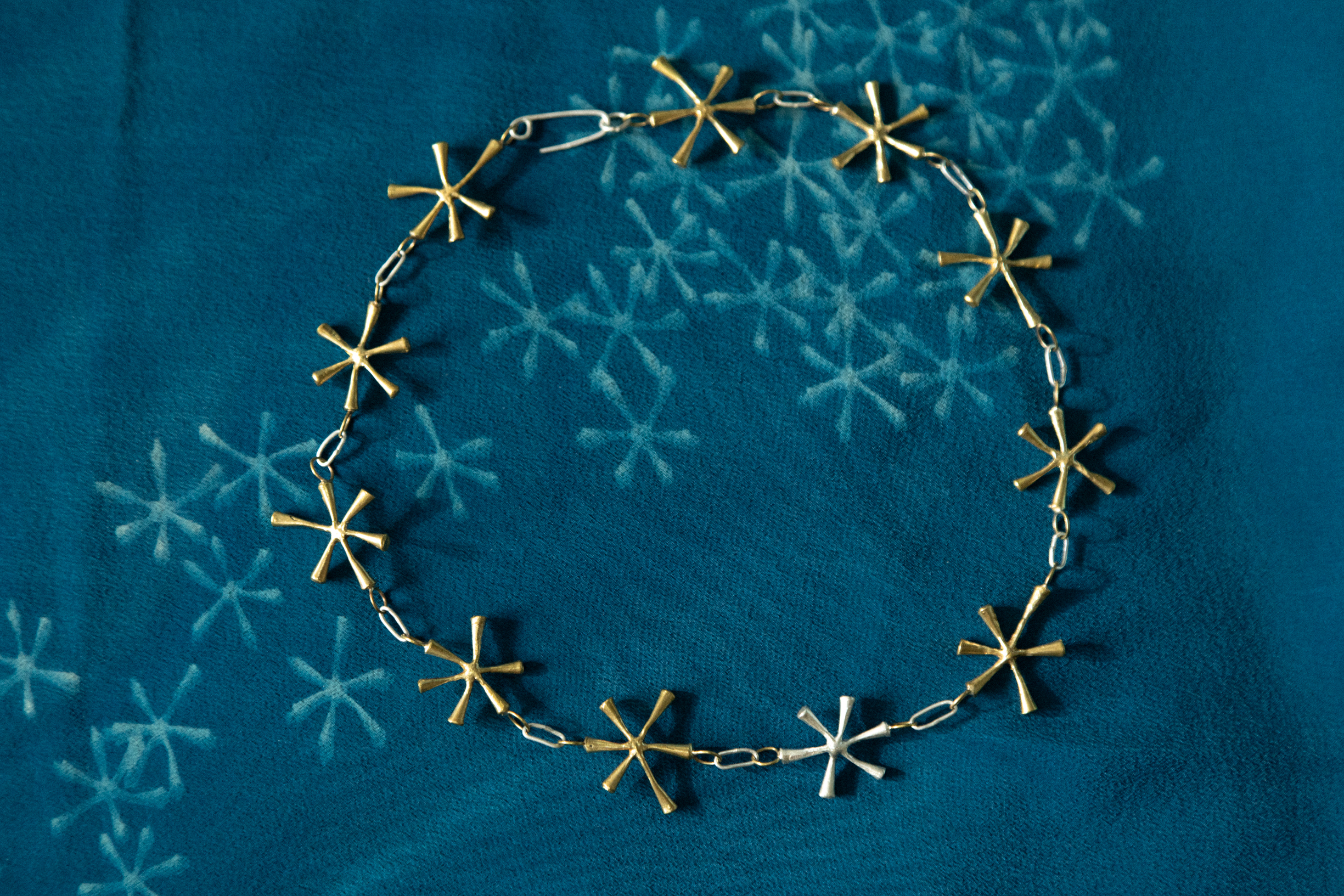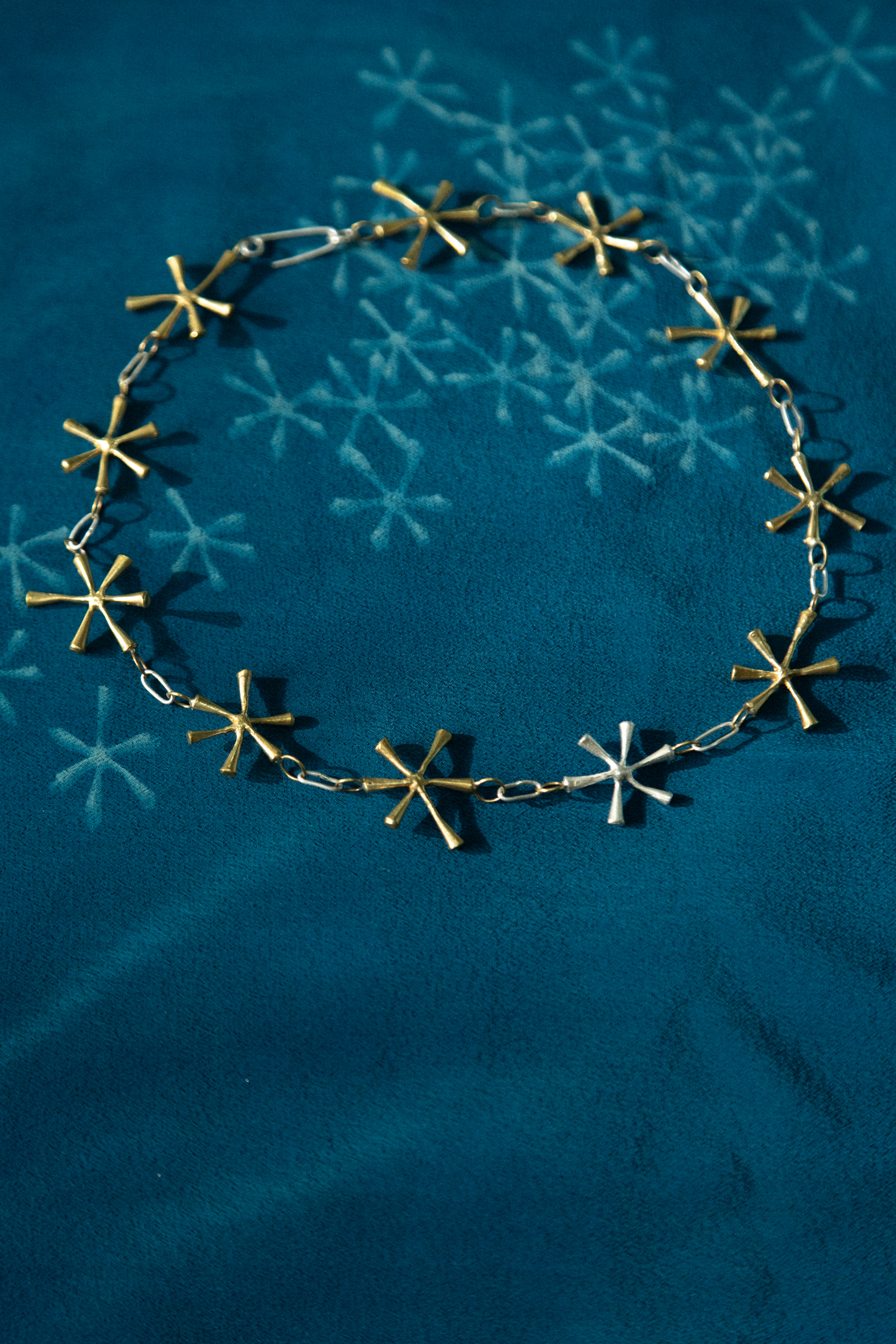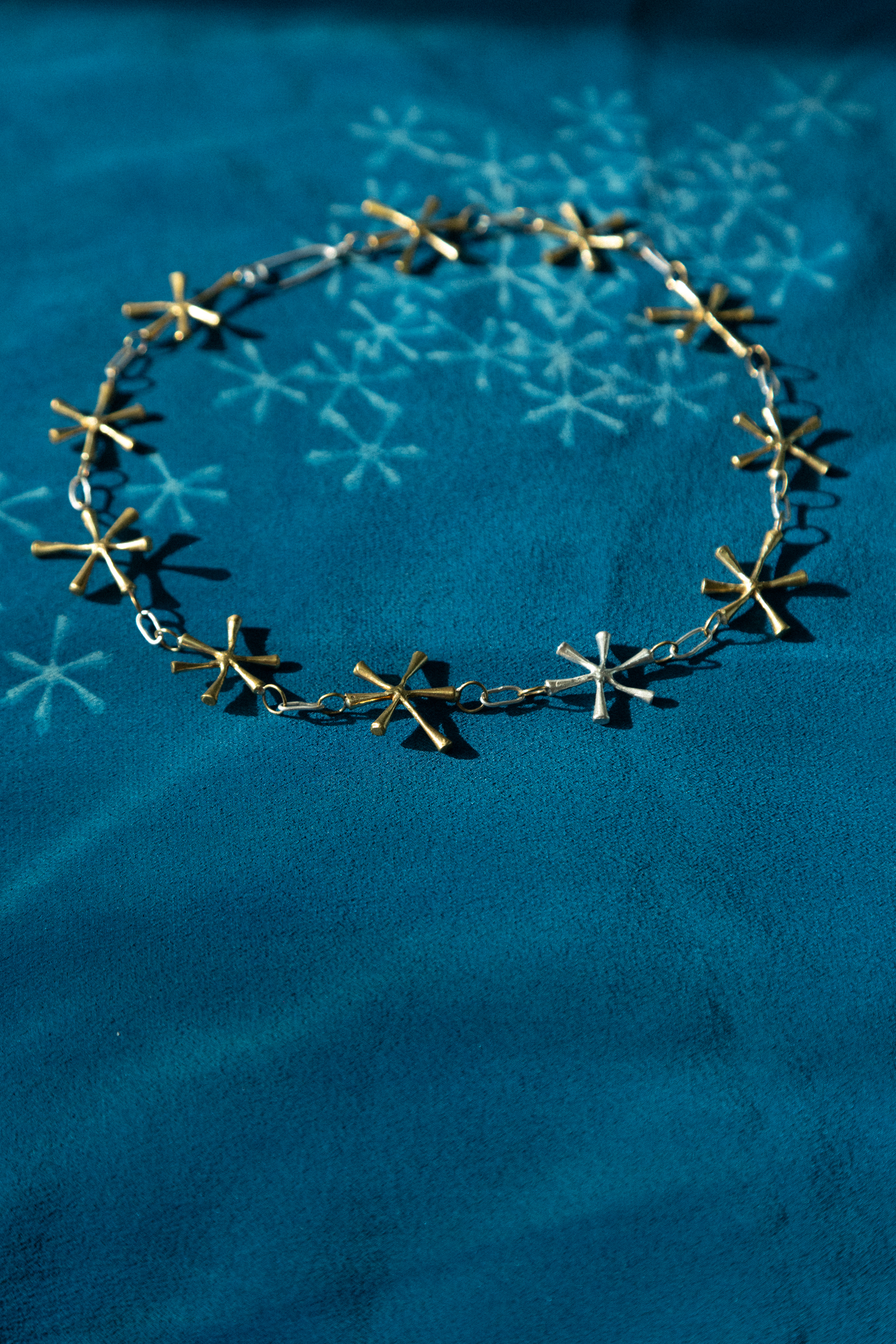 Colar composto de 10 estrelitzas douradas e 1 em prata, articuladas com elos e fecho em prata. O colar pode ser ajustável, o fecho cabe em todos os elos, podendo deixar uma ou mais estrelitzas pendurada nas costas. Esticado o colar tem 45cm de coomprimento por 2,5 de largura.