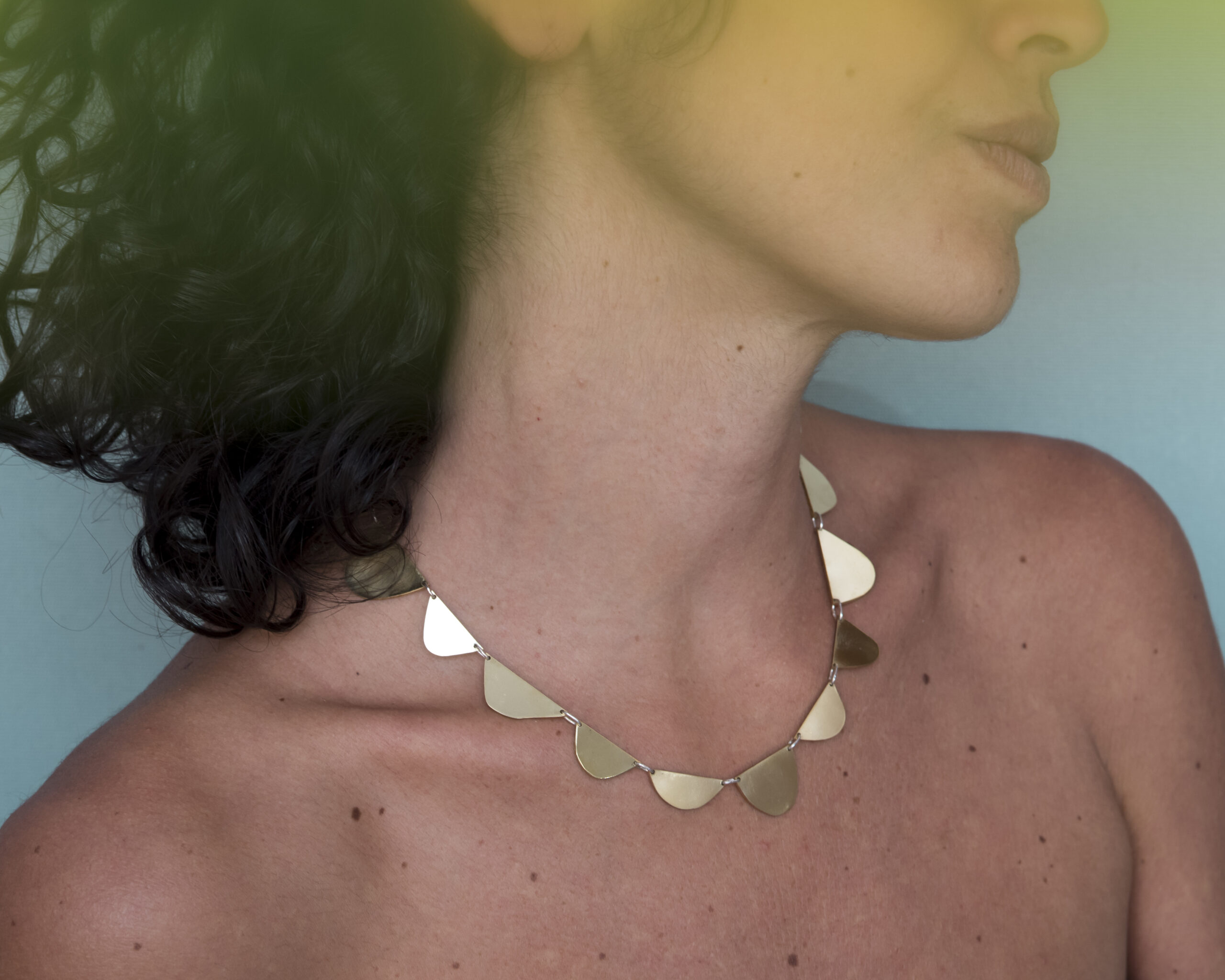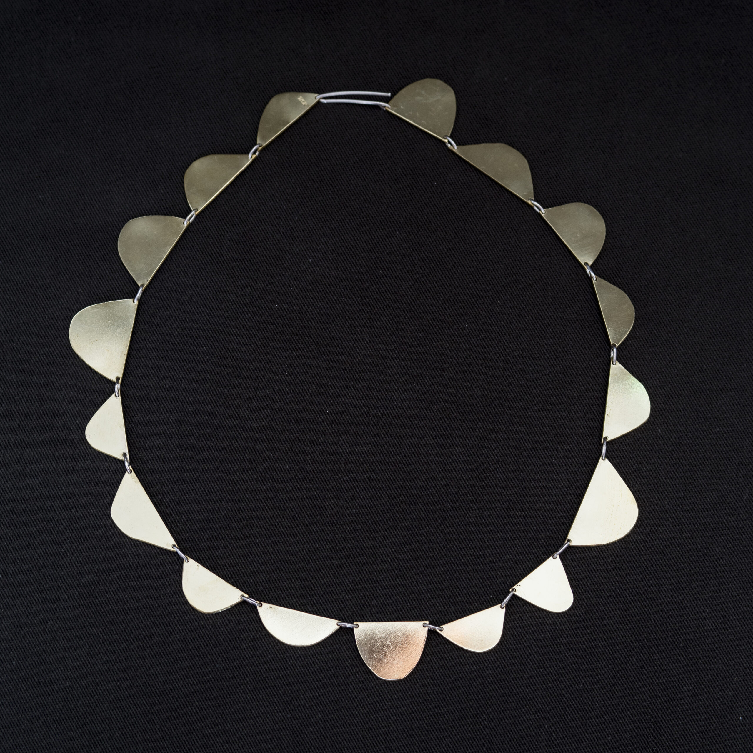 Colar com meias luas em latão, de tamanhos e formas diferentes, fecho e elos em prata.