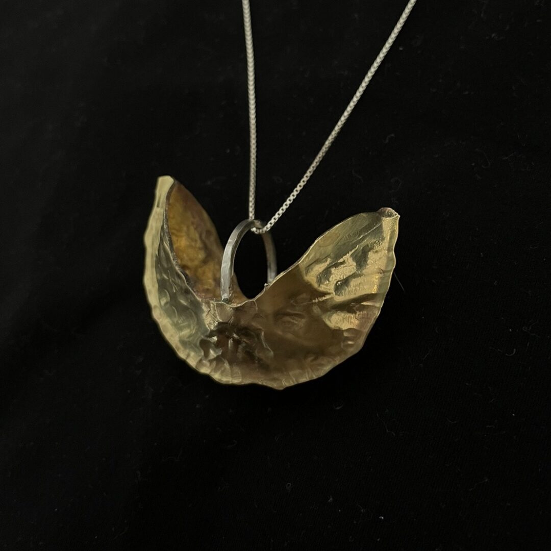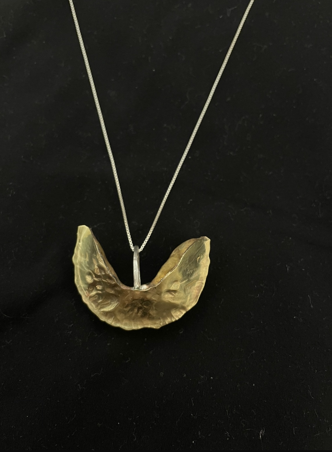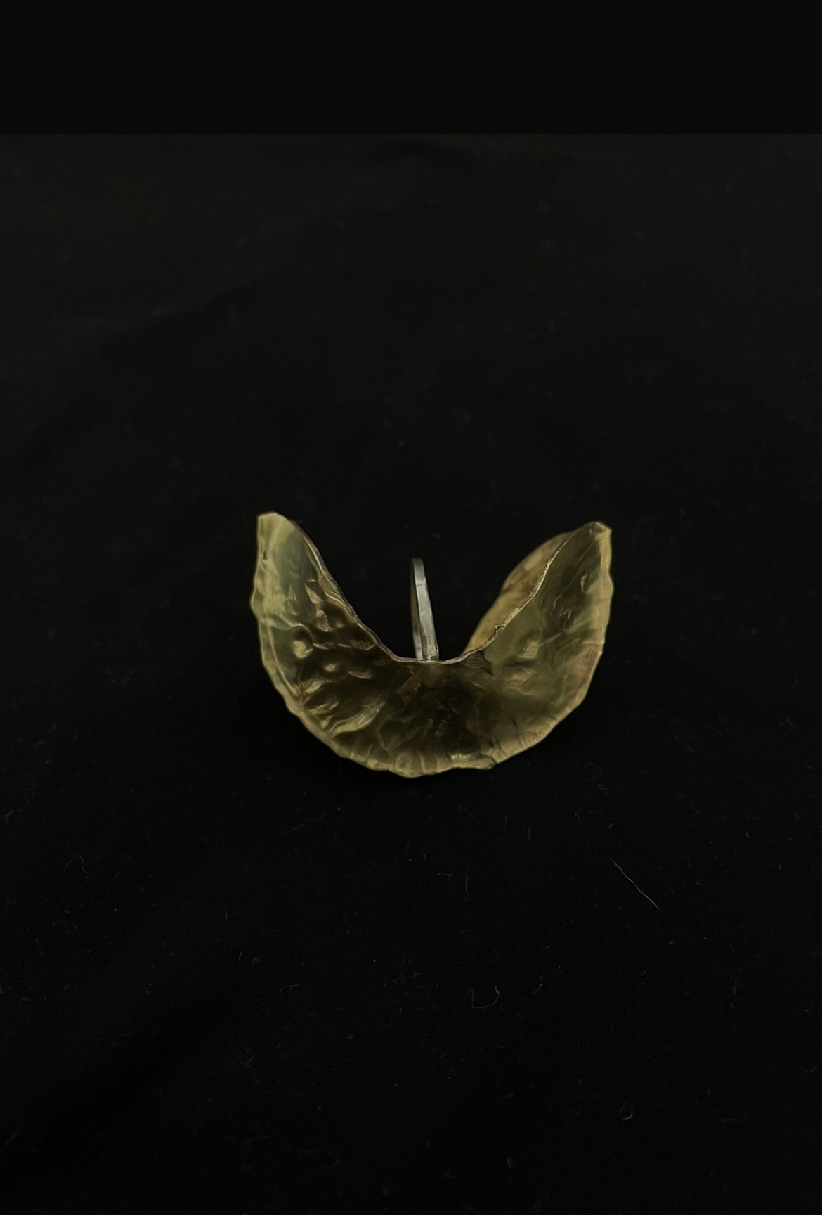 Peça feita a partir da forja, com um elo em prata para unir as duas beiras. Textura das marteladas no dourado do latão. Tamanho aproximado de 5cm x 3,5cm de altura.