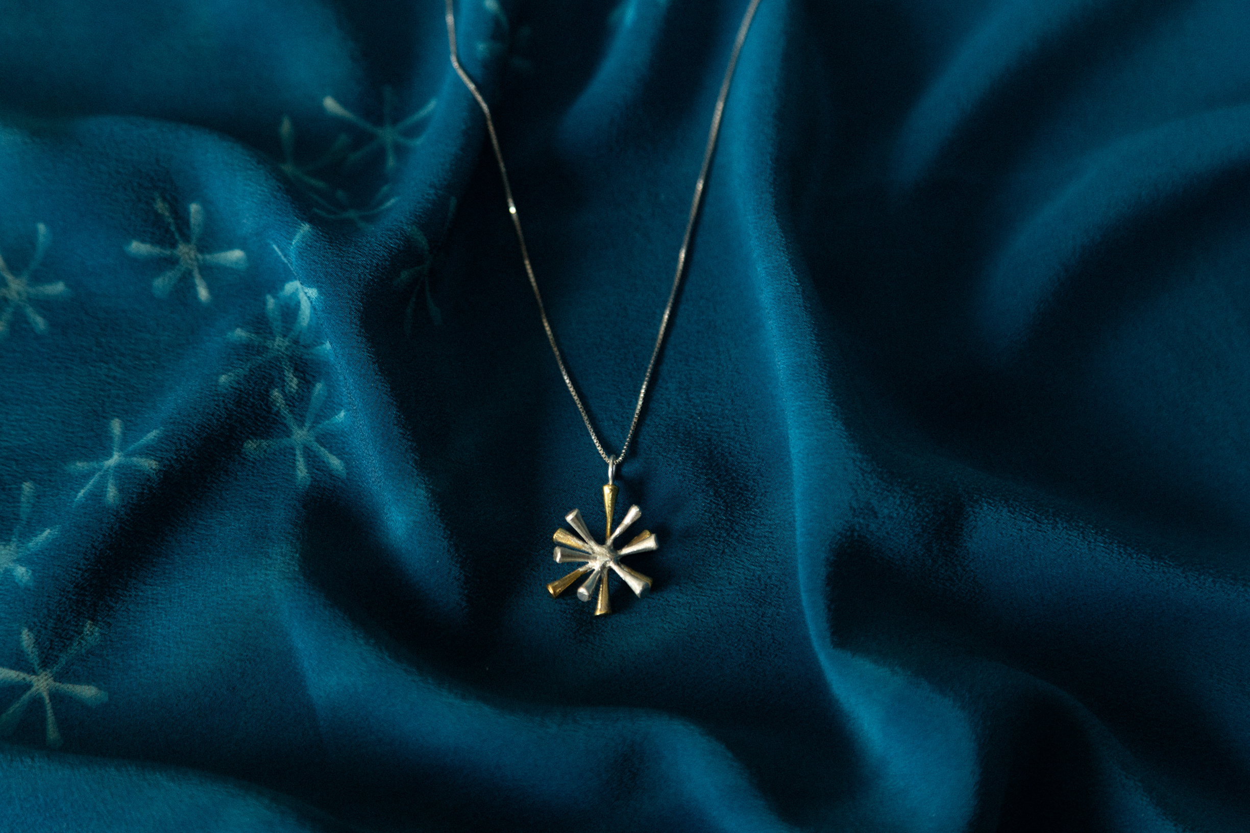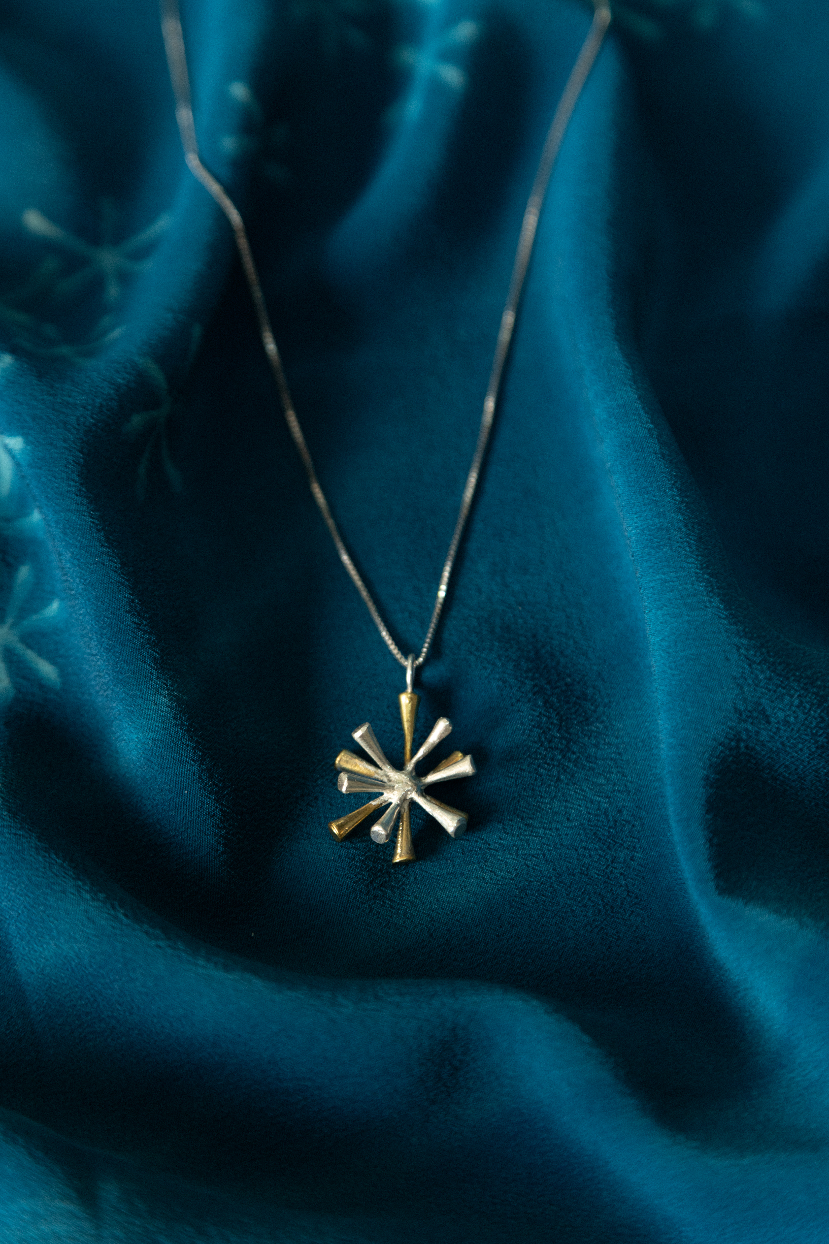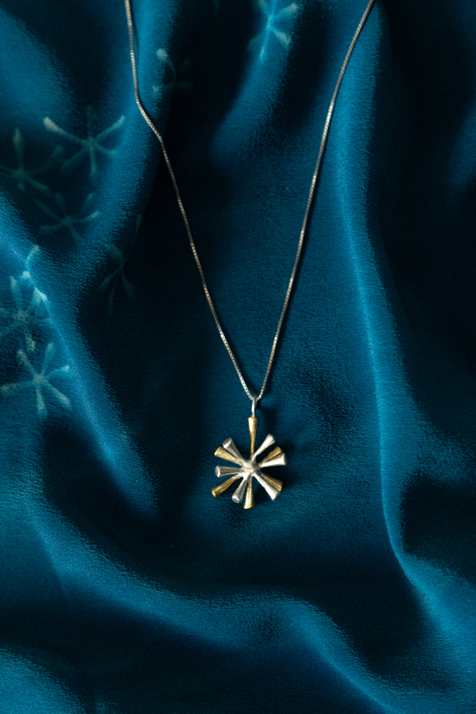 Pingente tipo uma flor sempre-viva em latão e prata, com elo redondo prata que pode ser usado em gargantilha P ou corrente. Peça de aproximadamente 3 cm de altura por 2cm de largura.