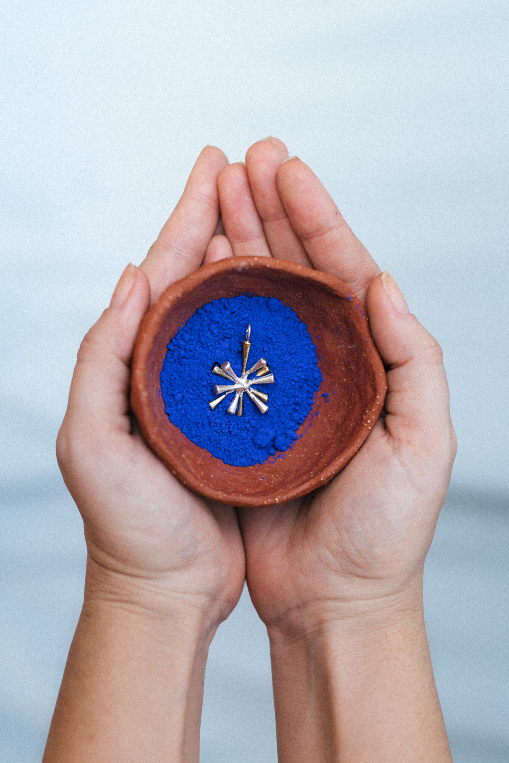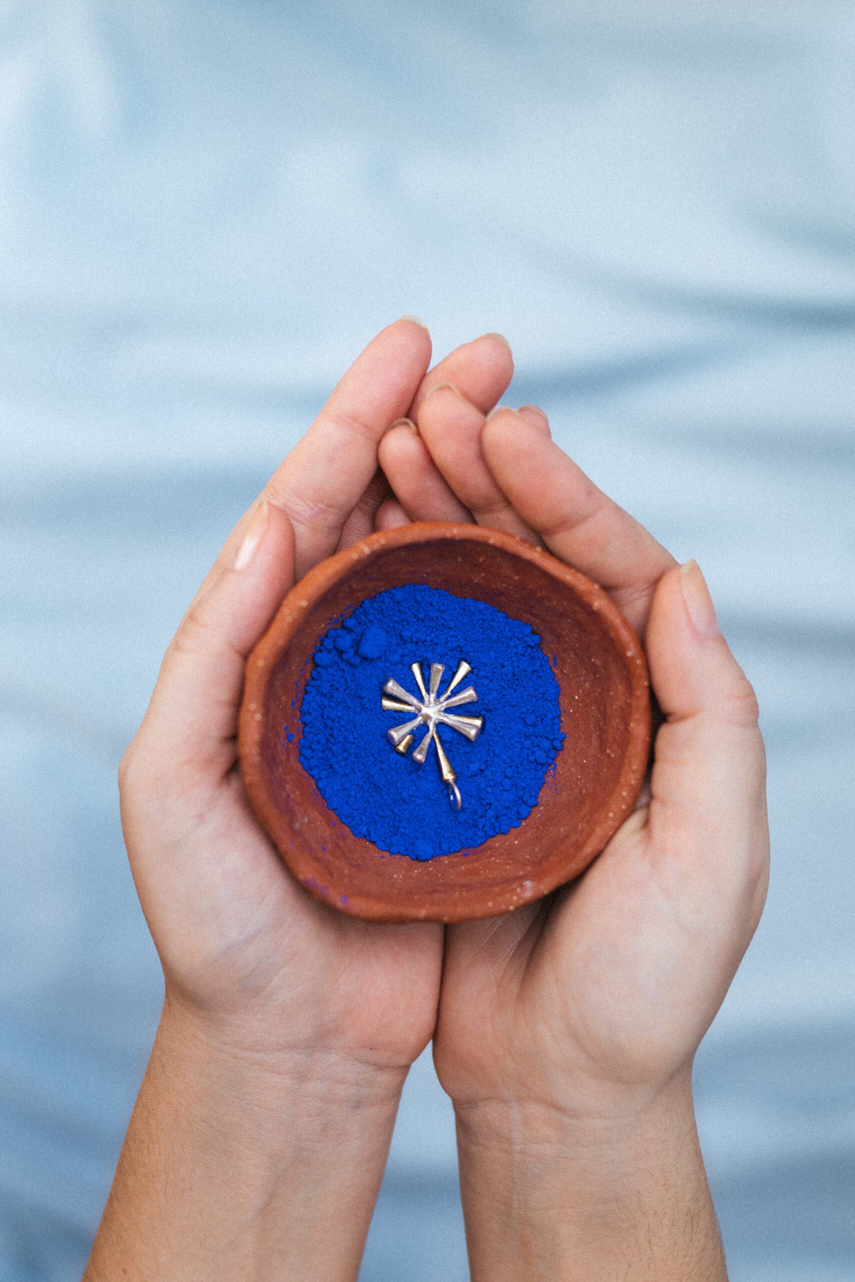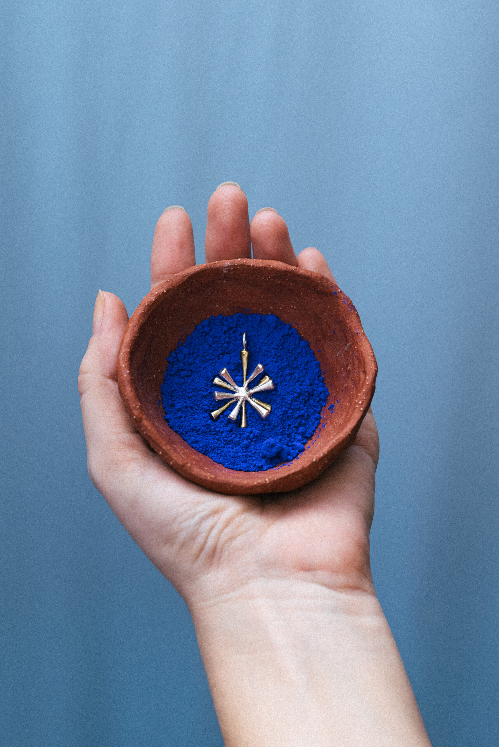 Pingente tipo uma flor sempre-viva em latão e prata, com elo redondo prata que pode ser usado em gargantilha P ou corrente. Peça de aproximadamente 3 cm de altura por 2cm de largura.