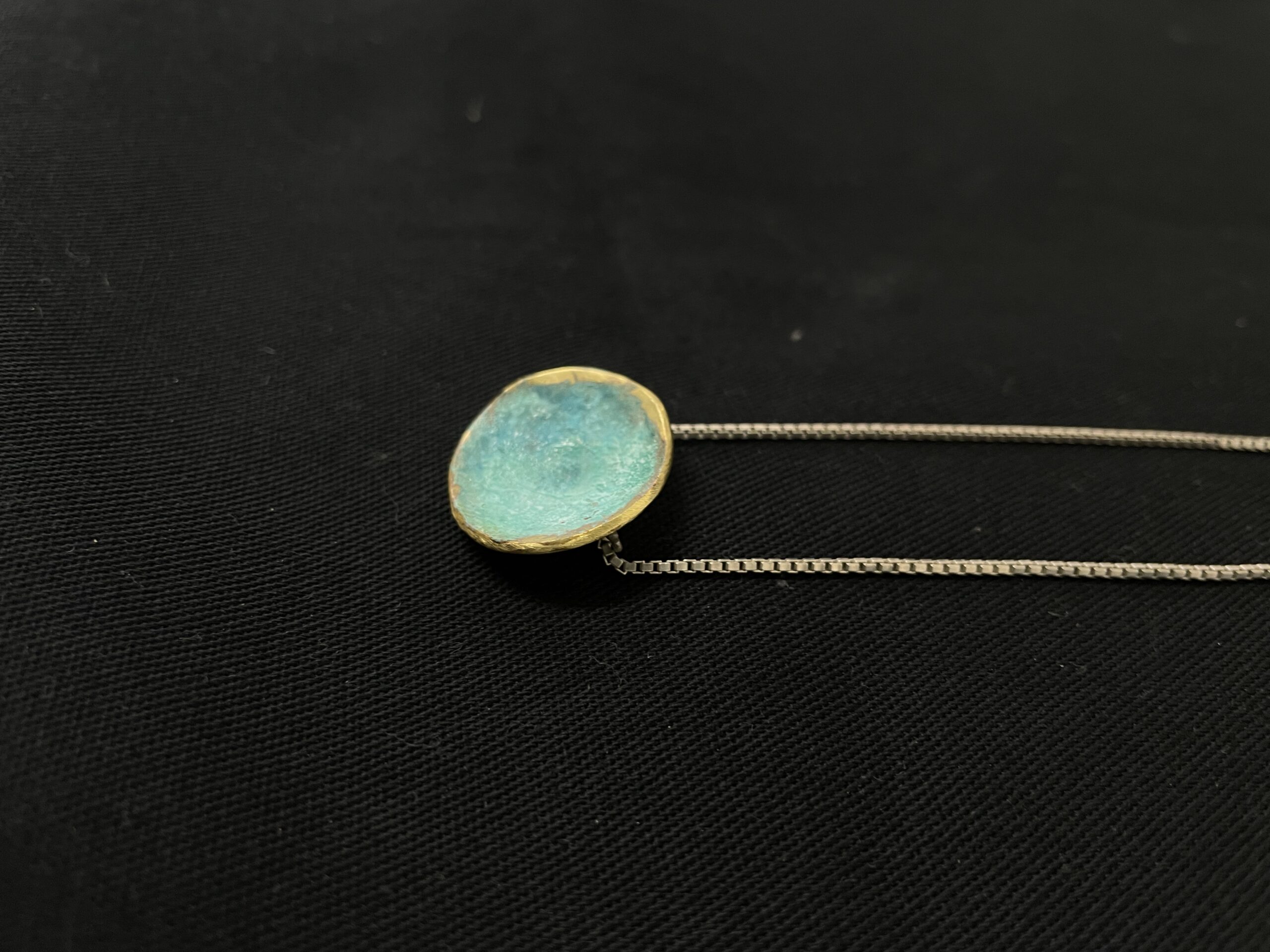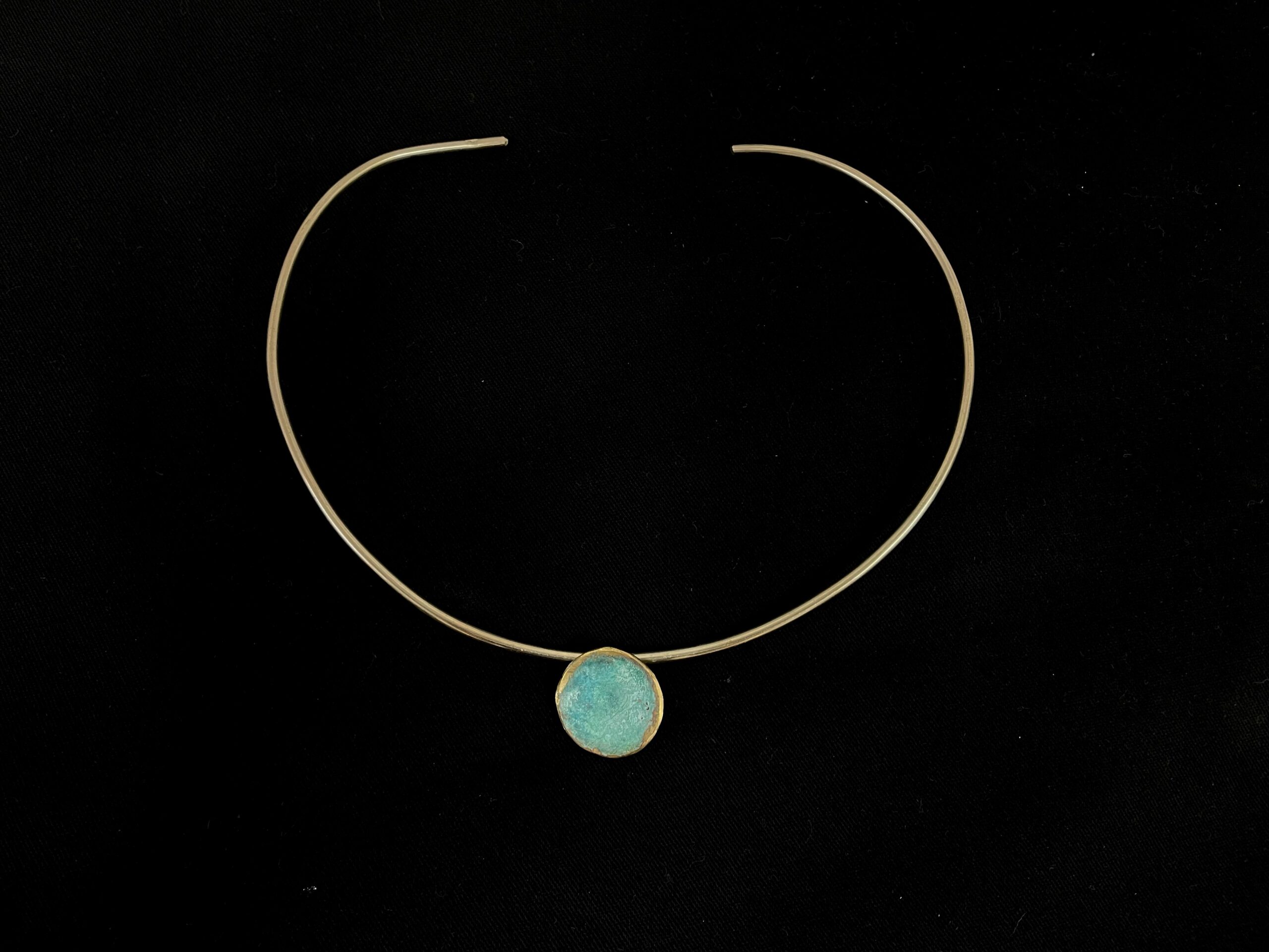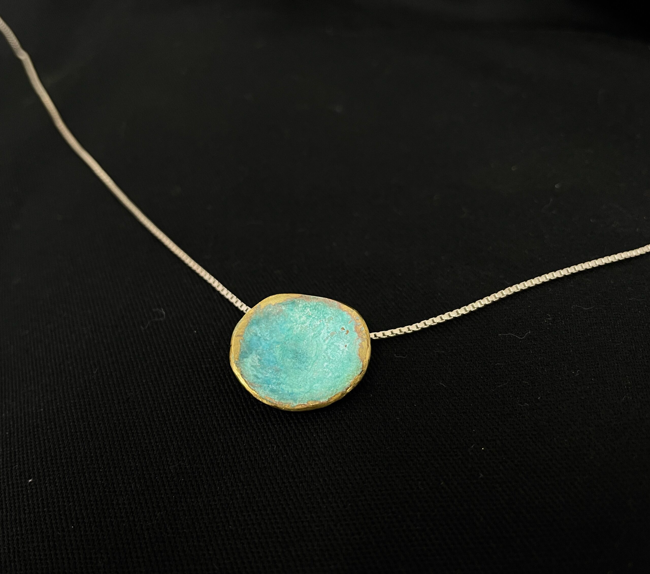 Peça redonda côncava em latão com pátina esverdeada. Tamanho aprox. de 2cm x 2cm.
