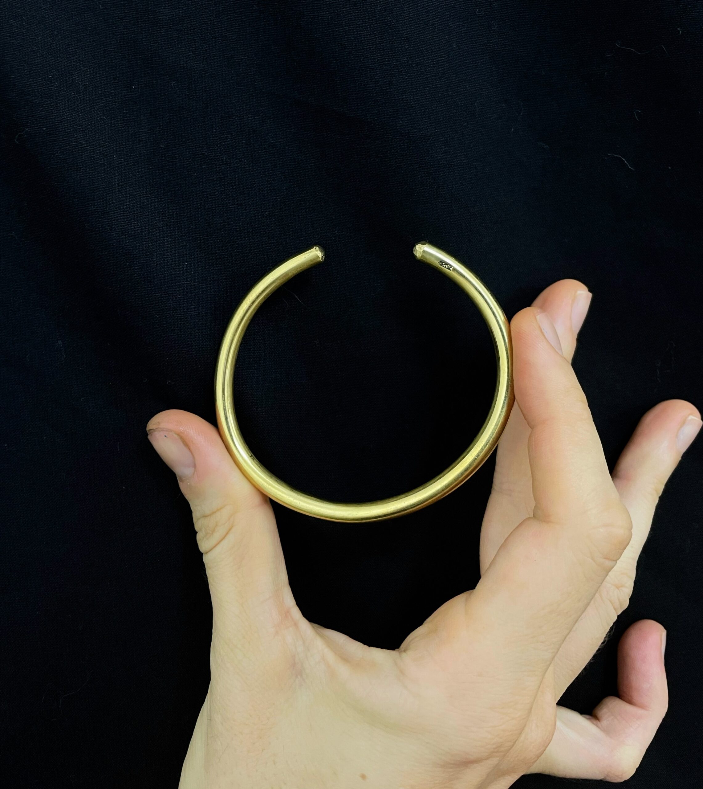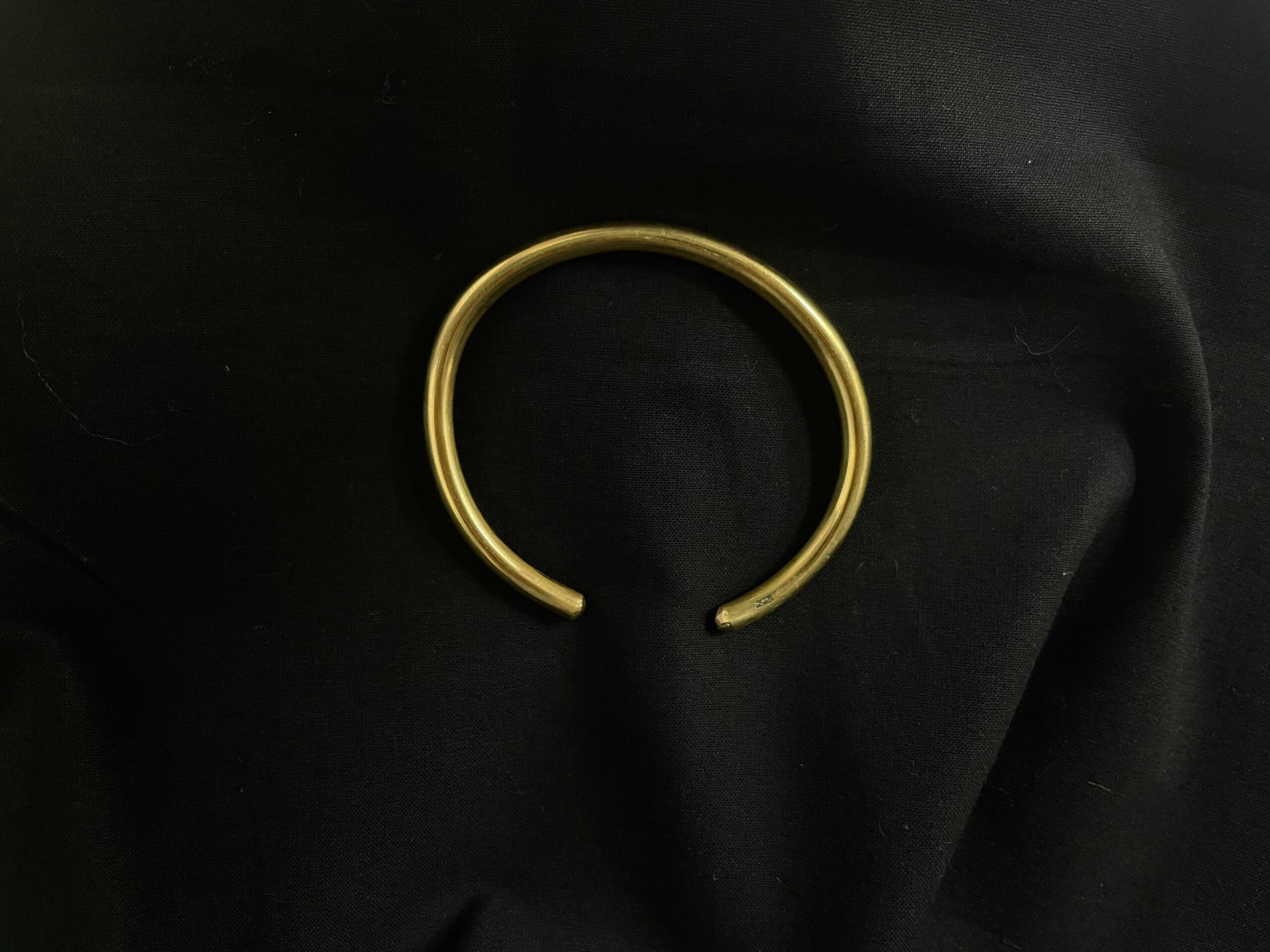 Pulseira em latão de aro redondo com pequena abertura. Tamanho aproximado do diâmetro interno de 6cm.