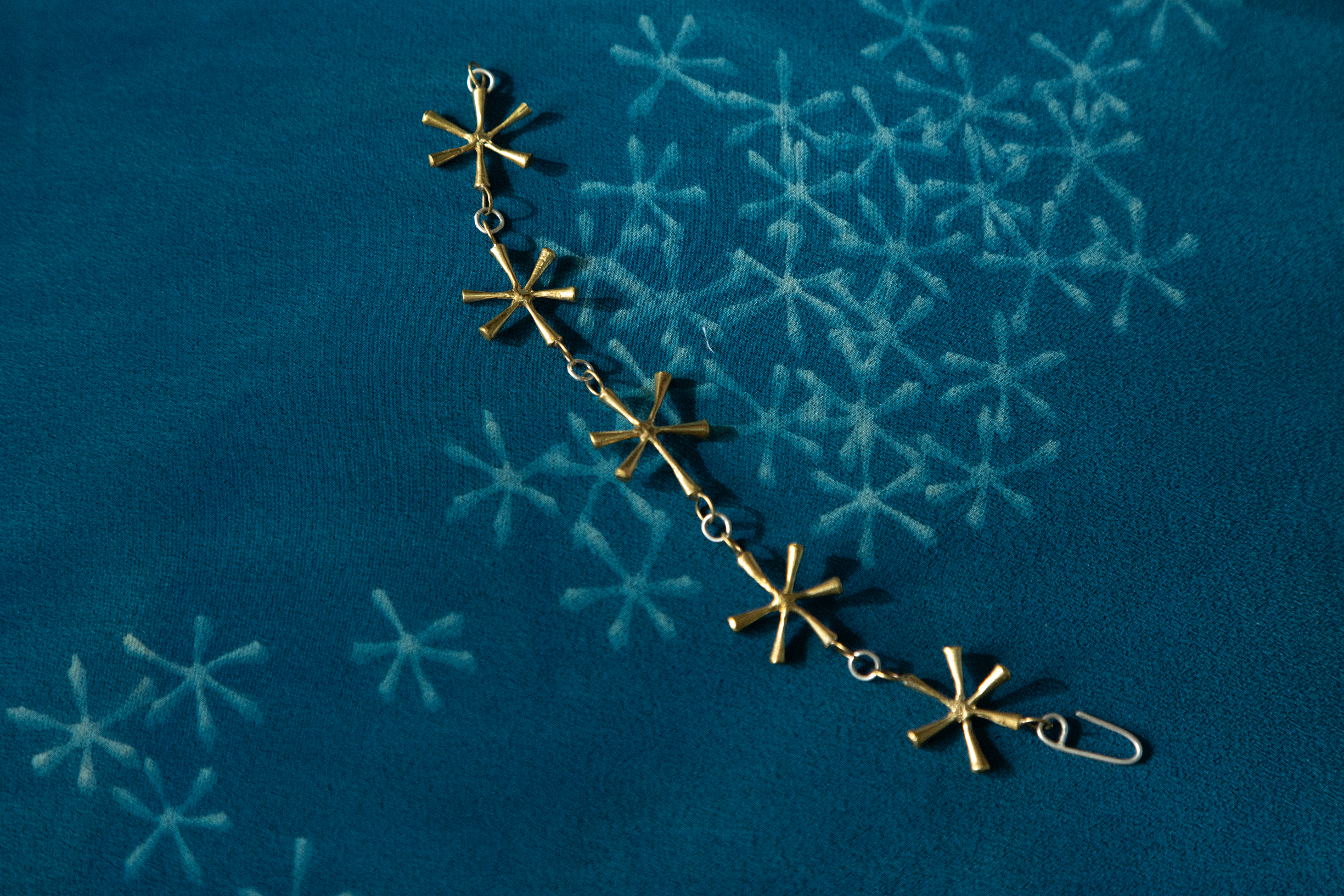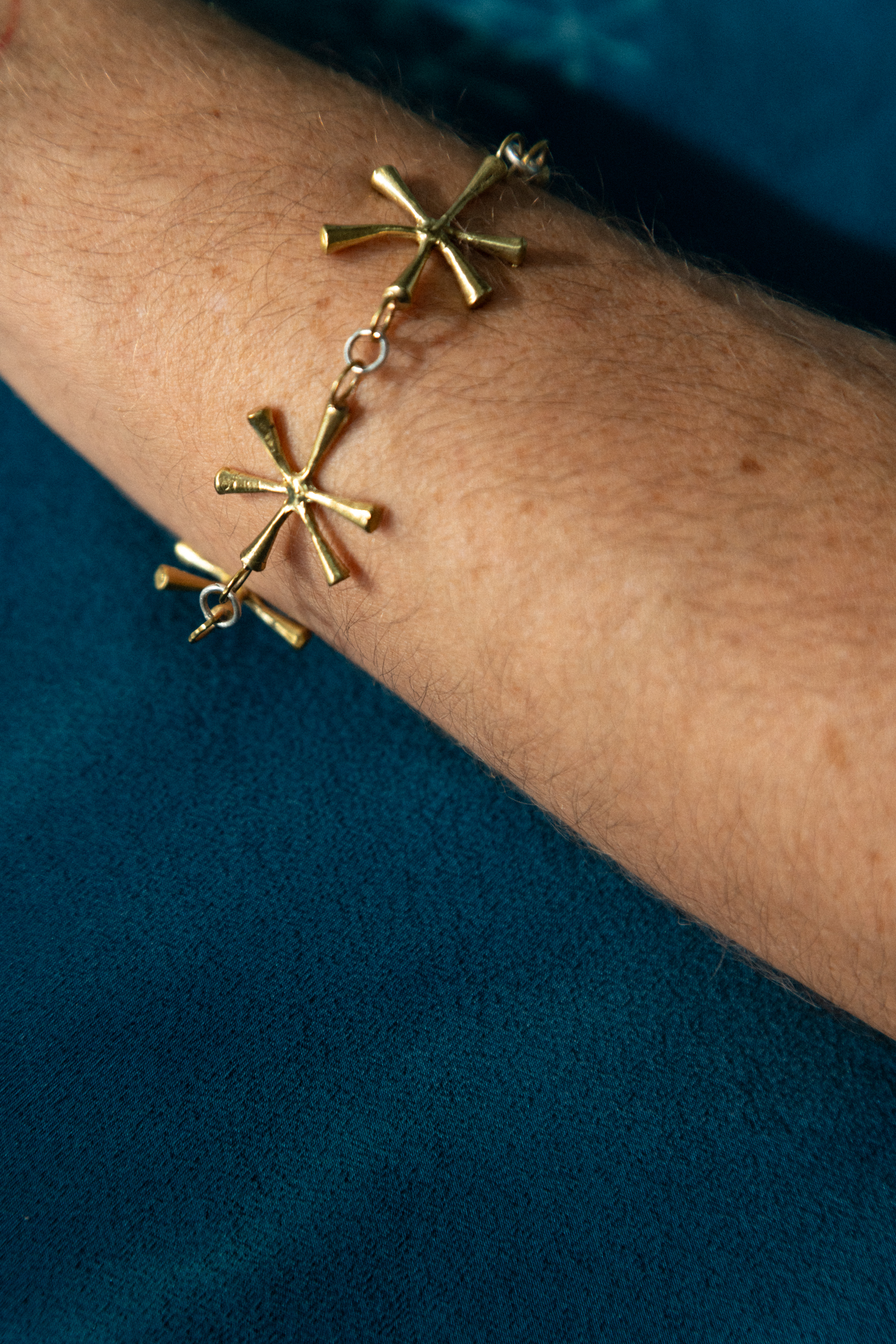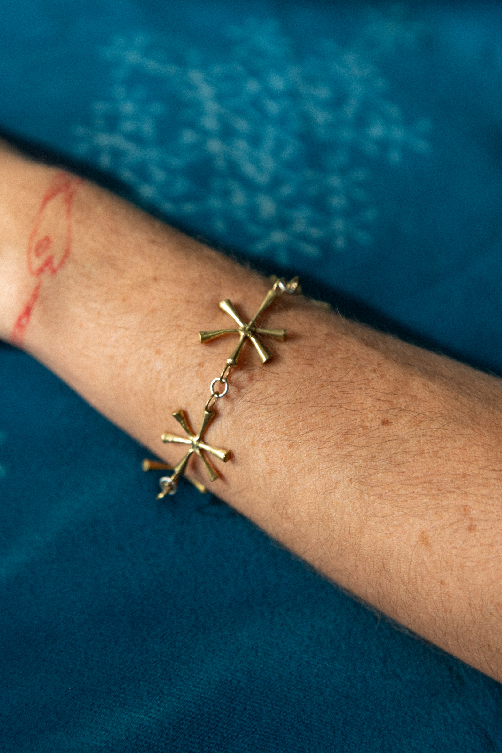 Pulseira composta por 5 estrelitzas, articuladas com fio e fecho de prata. Tem aproximadamente 20cm de largura e pode ser ajustada, colocando o fecho em diferentes pontos.