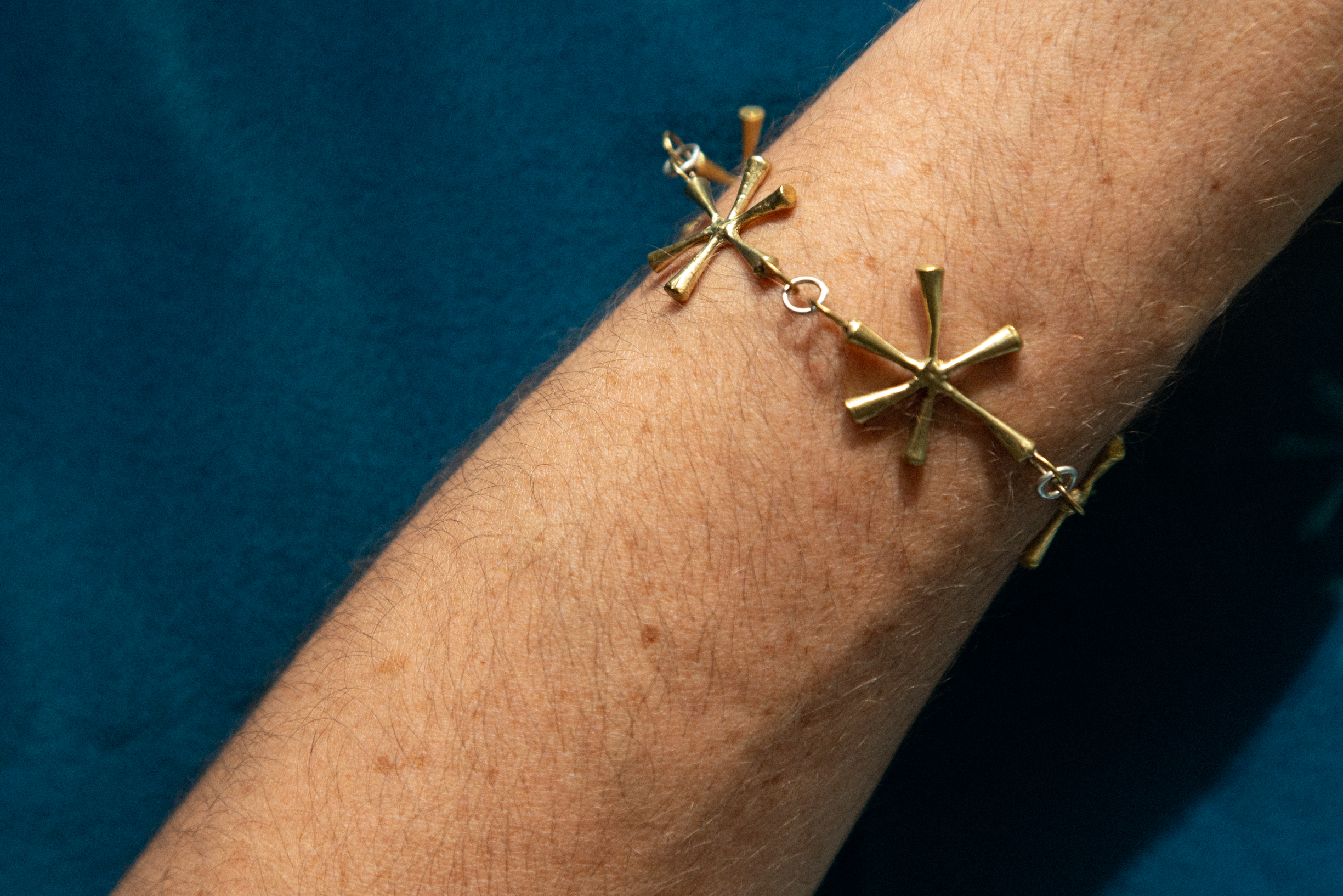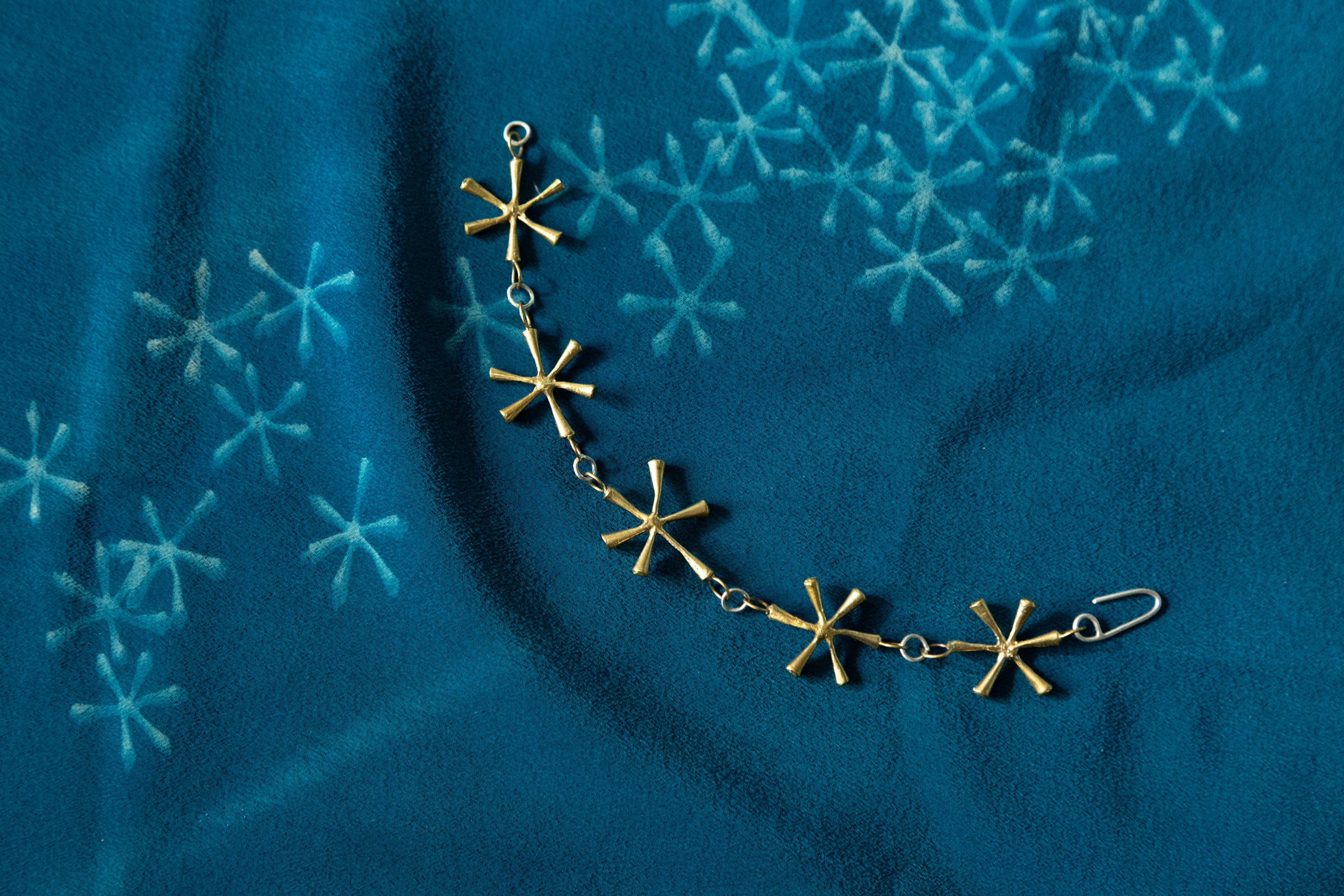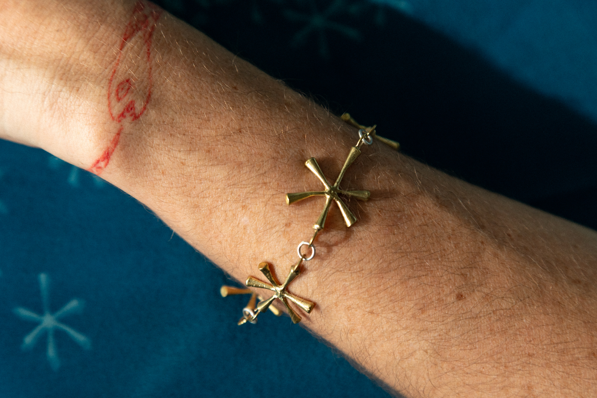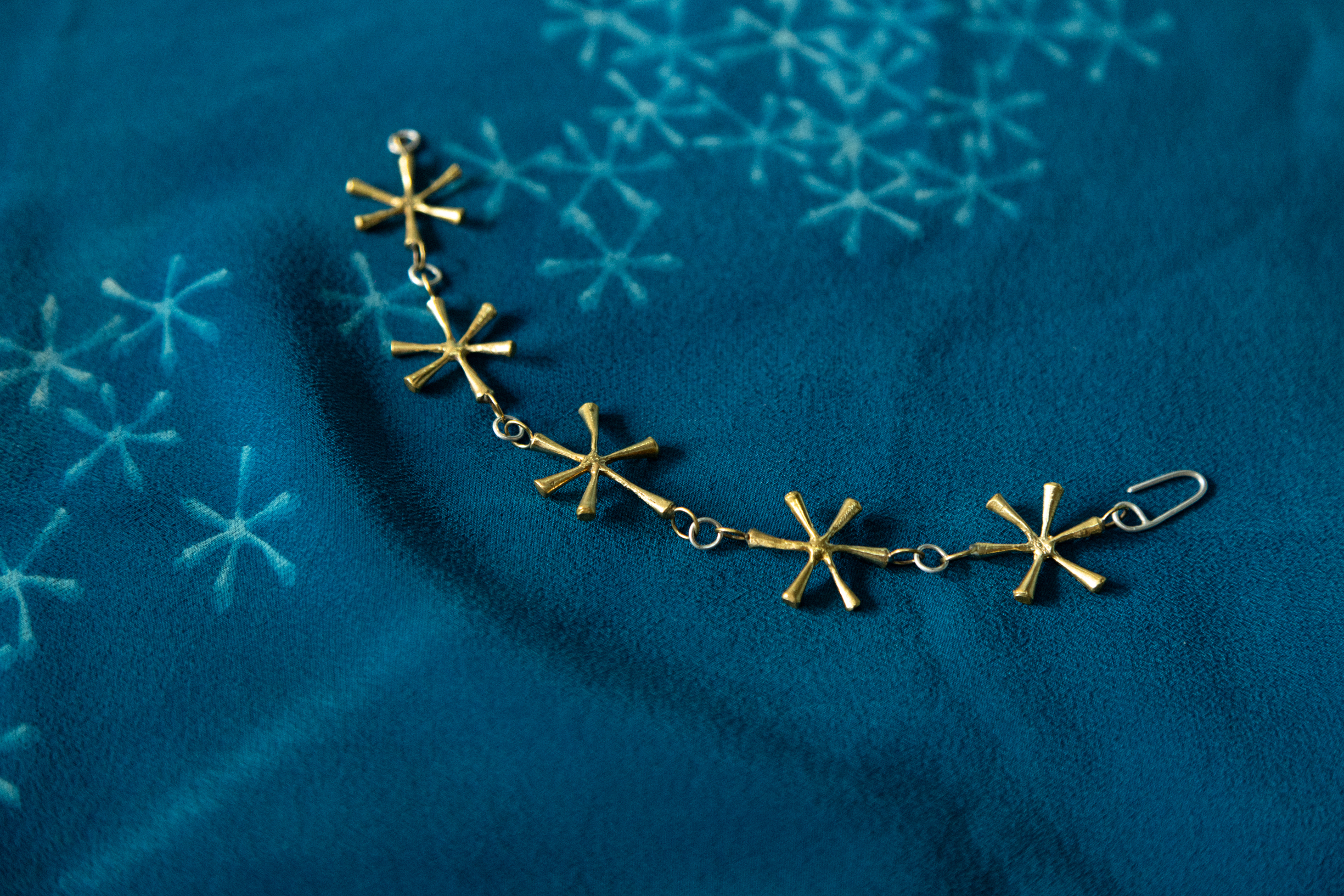 Pulseira composta por 5 estrelitzas, articuladas com fio e fecho de prata. Tem aproximadamente 20cm de largura e pode ser ajustada, colocando o fecho em diferentes pontos.